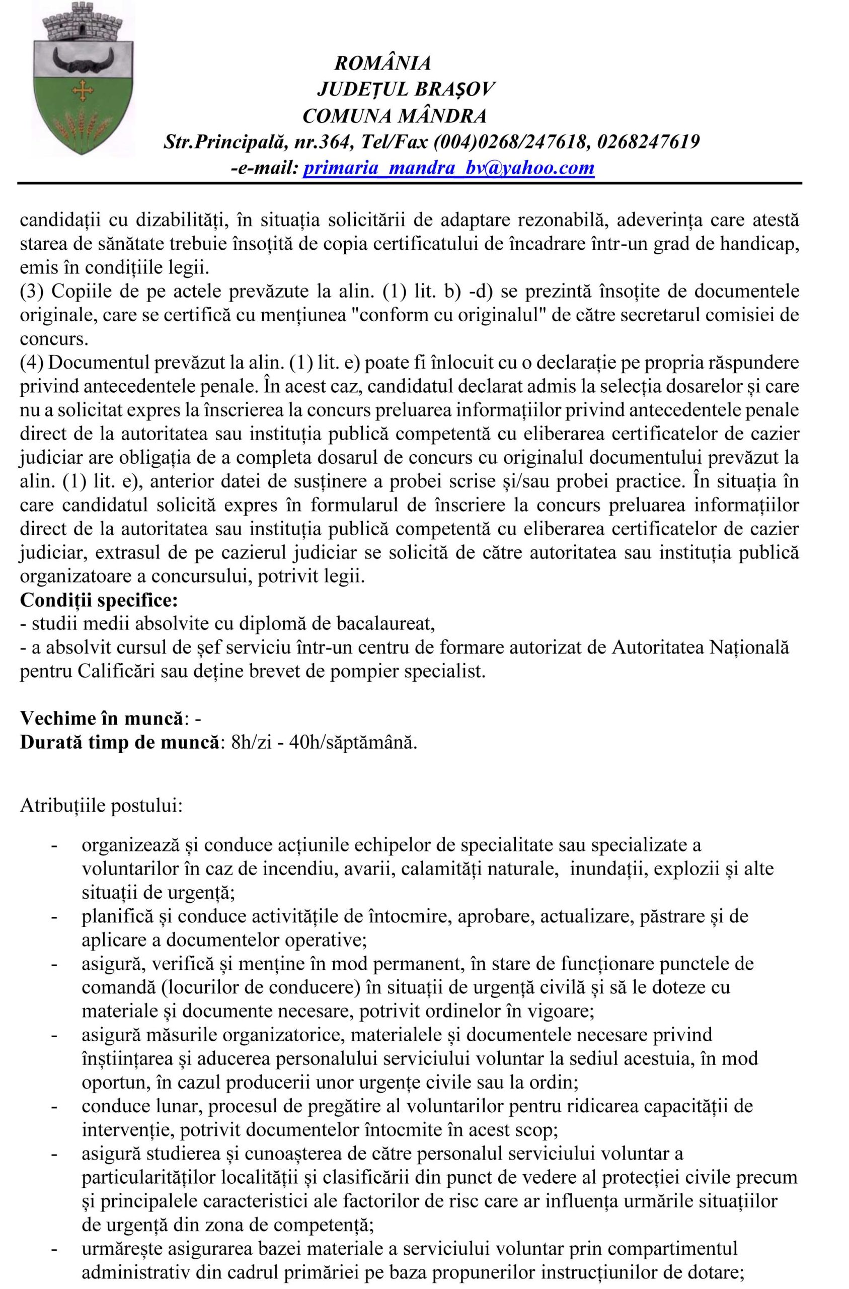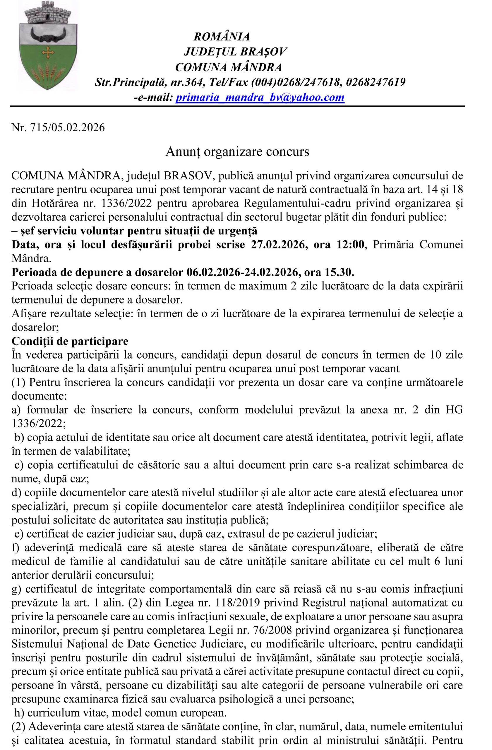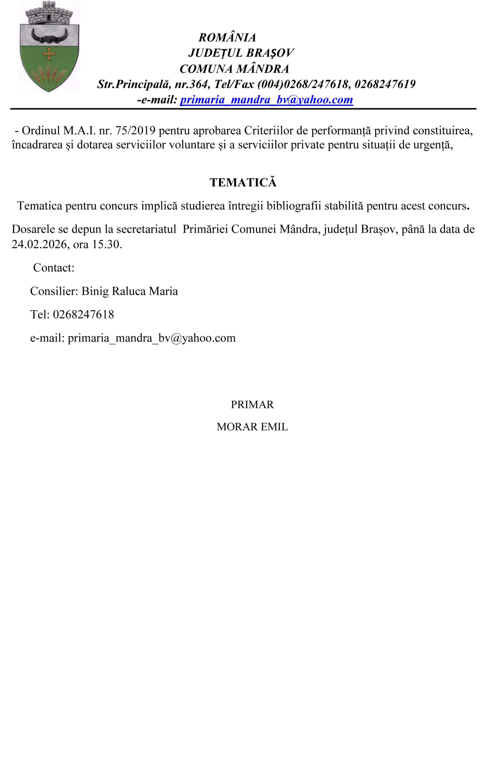 Dosarele se depun la secretariatul Primăriei Comunei Mândra, județul Brașov, până la data de 24.02.2026, ora 15.30.