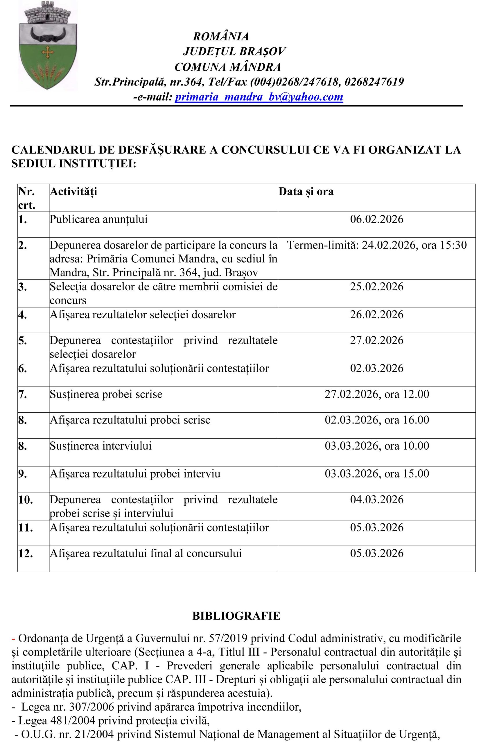 2. Depunerea dosarelor de participare la concurs la adresa: Primăria Comunei Mandra, cu sediul în Mandra, Str. Principală nr. 364, jud. Brașov Termen-limită: 24.02.2026, ora 15:30