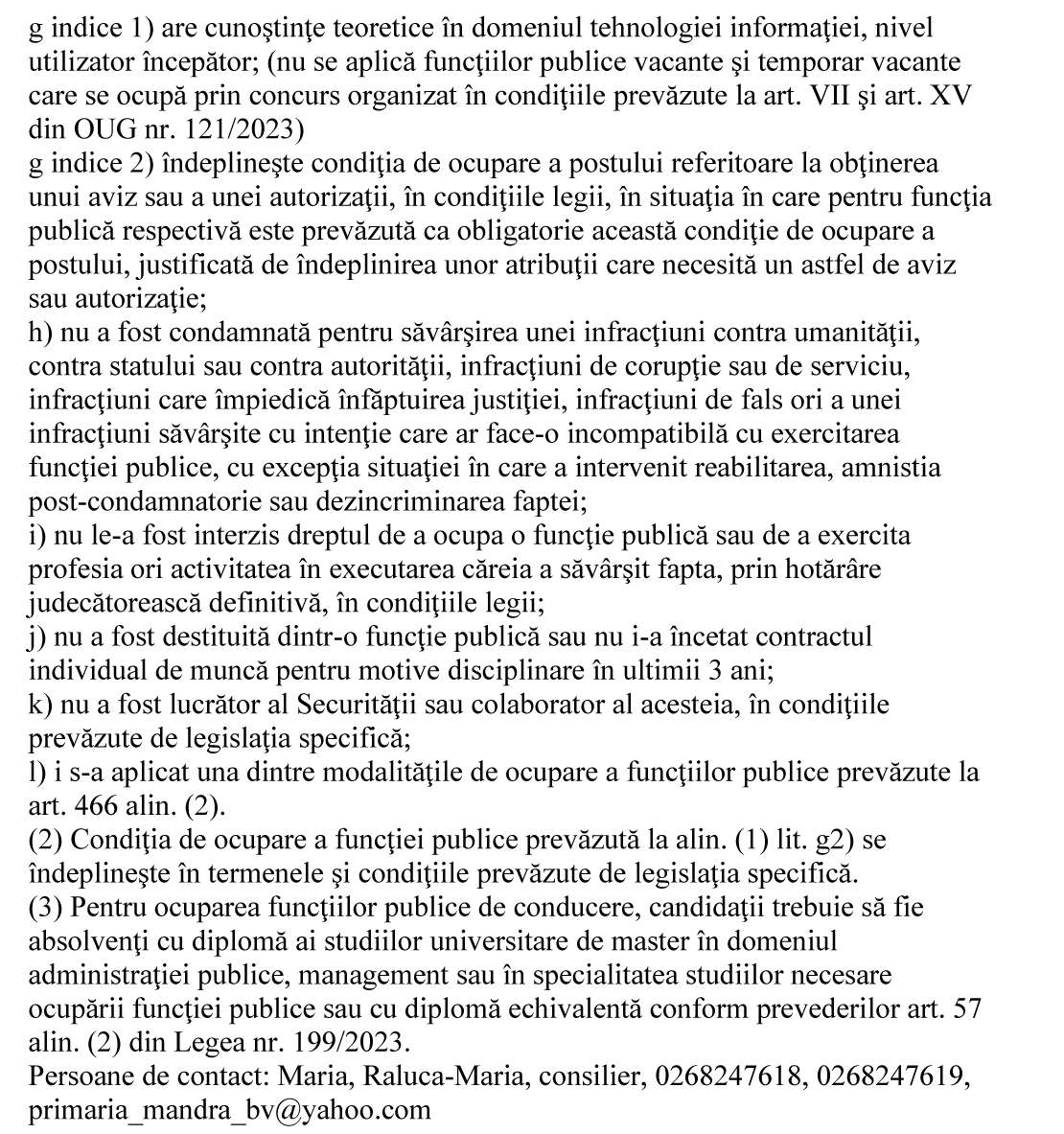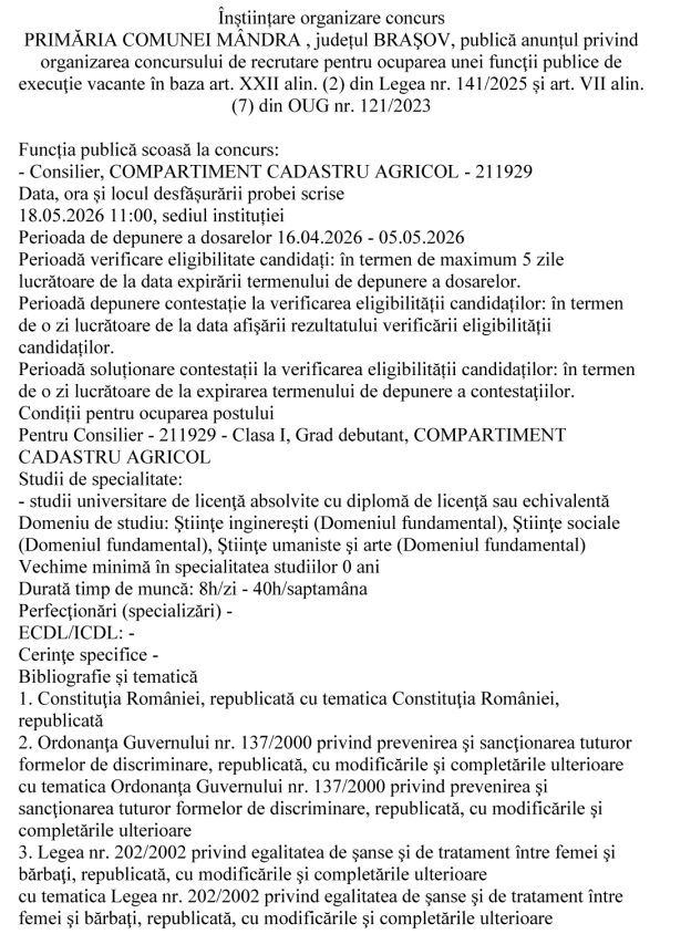 Înștiințare organizare concurs PRIMĂRIA COMUNEI MÂNDRA , județul BRAŞOV, publică anunțul privind organizarea concursului de recrutare pentru ocuparea unei funcţii publice de execuţie vacante în baza art. XXII alin. (2) din Legea nr. 141/2025 și art. VII alin. (7) din OUG nr. 121/2023