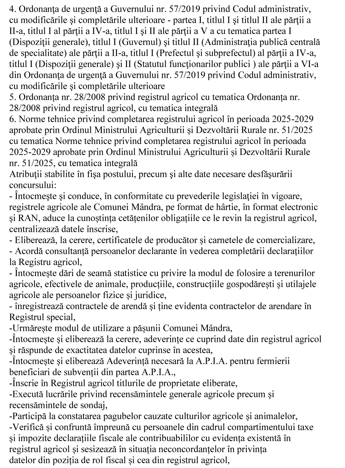 – Întocmeşte şi conduce, în conformitate cu prevederile legislaţiei în vigoare, registrele agricole ale Comunei Mândra, pe format de hârtie, în format electronic și RAN, aduce la cunoștința cetățenilor obligațiile ce le revin la registrul agricol, centralizează datele înscrise,