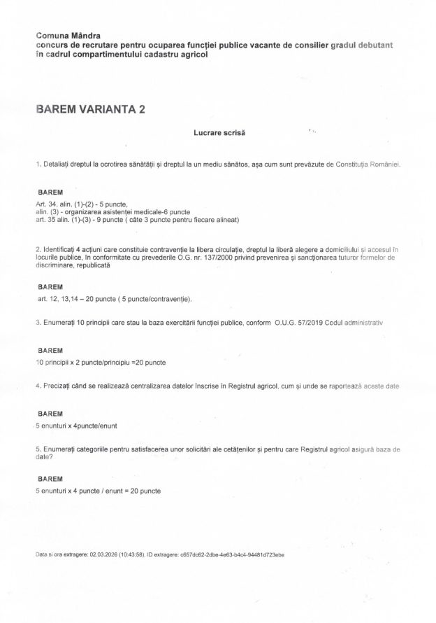 Barem corectare subiecte – Concurs de recrutare pentru ocuparea functiei de consilier gradul debutant in cadrul compartimentului cadastru agricol Comuna Mandra – Concurs de recrutare pentru ocuparea functiei publice vacante de consilier gradul debutant in cadrul compartimentului cadastru agricol BAREM VARIANTA 2 Lucrare scrisa