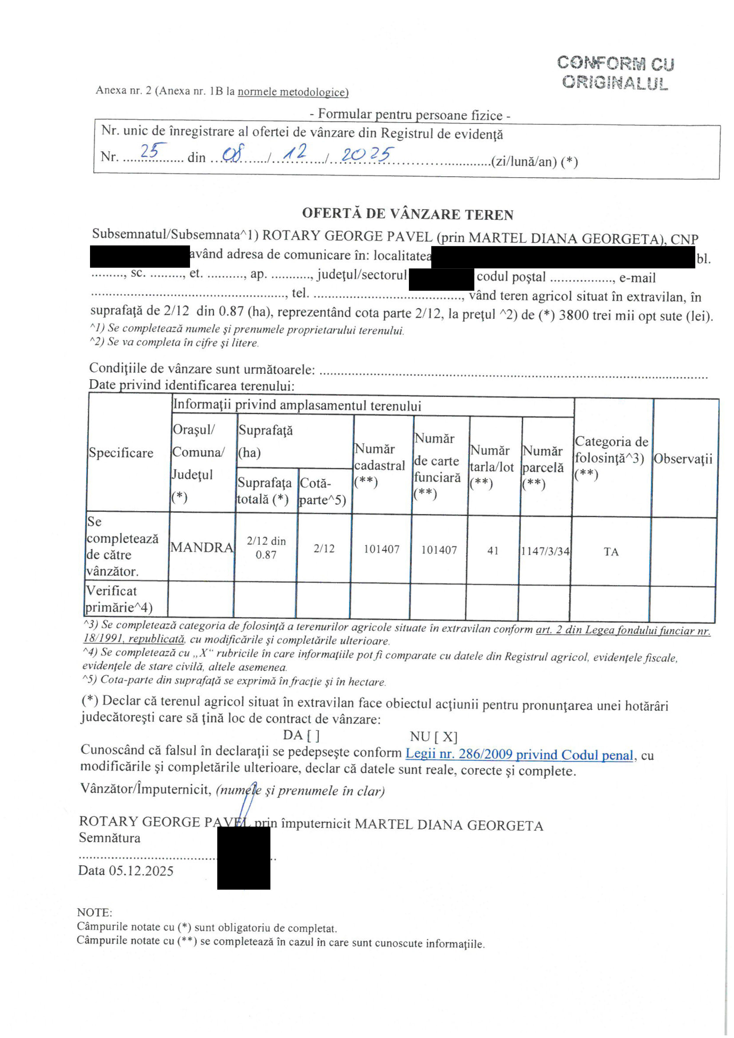 Ofertă de vânzare teren. Primăria comunei Mândra propune spre vanzare un teren situat pe raza comunei, categorii de folosință: teren arabil. Terenul este situat în localitatea Mândra, Județul Brașov.