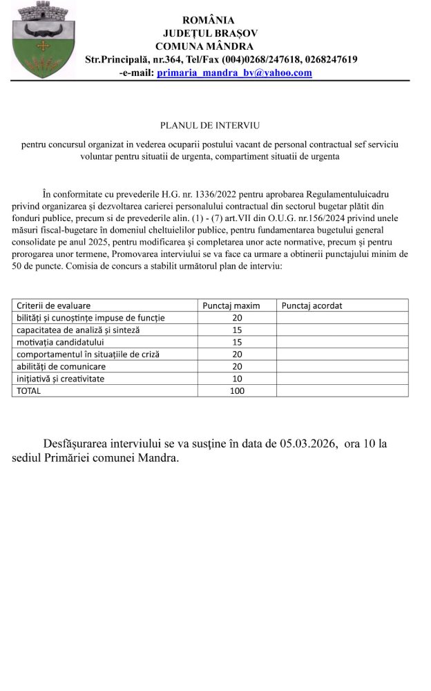 Desfășurarea interviului se va susţine în data de 05.03.2026, ora 10 la sediul Primăriei comunei Mandra.