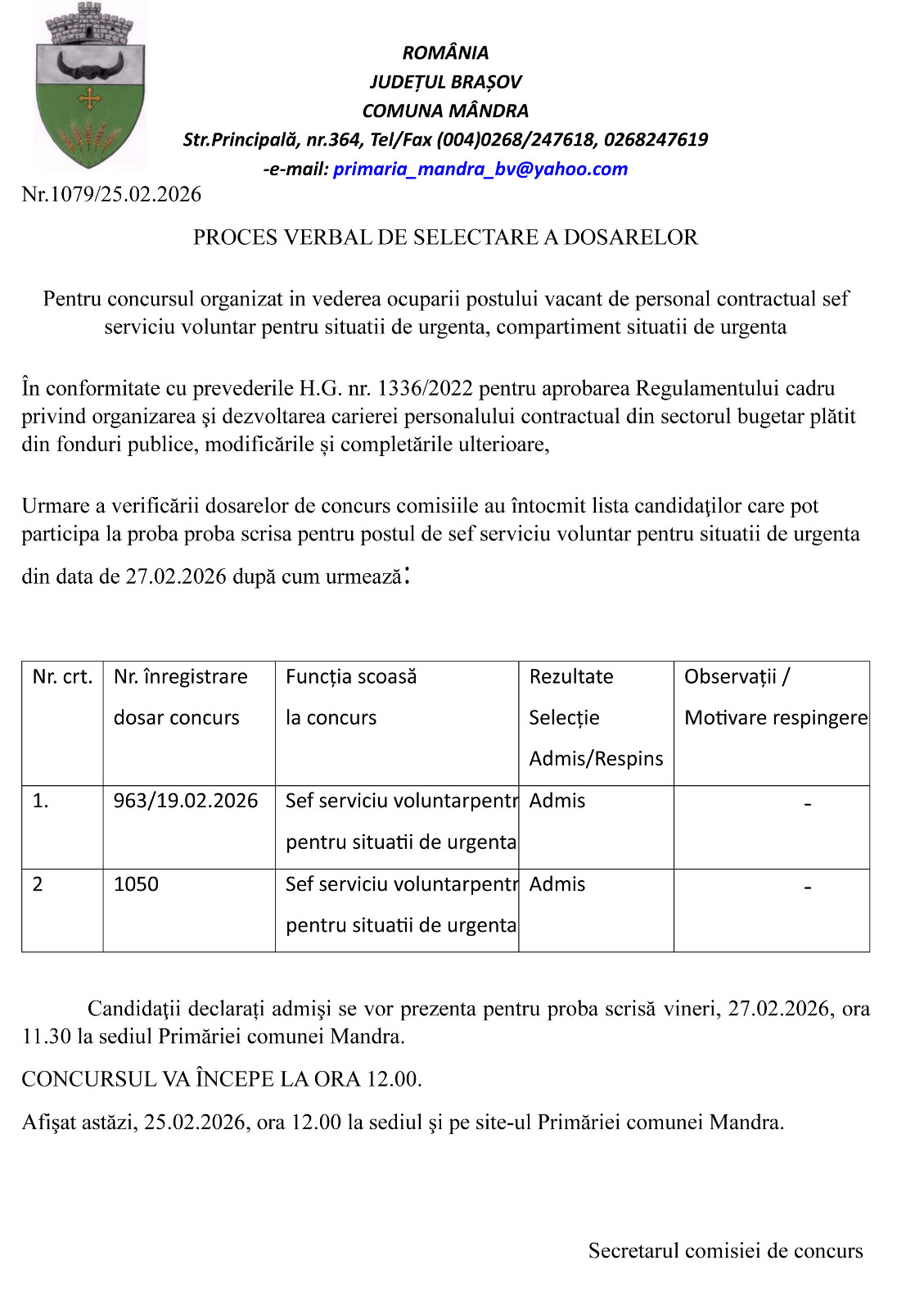 Candidaţii declarați admişi se vor prezenta pentru proba scrisă vineri, 27.02.2026, ora 11.30 la sediul Primăriei comunei Mandra.