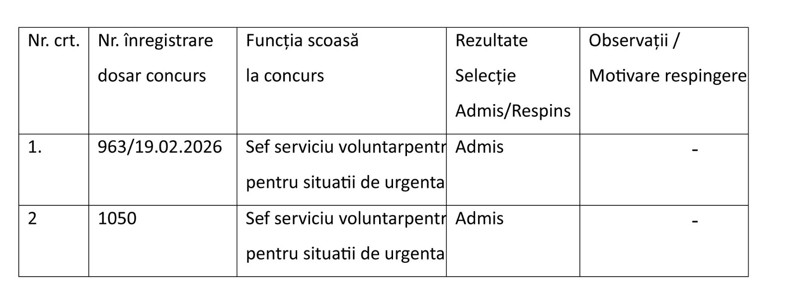 Urmare a verificării dosarelor de concurs comisiile au întocmit lista candidaţilor care pot participa la proba proba scrisa pentru postul de sef serviciu voluntar pentru situatii de urgenta din data de 27.02.2026 după cum urmează: